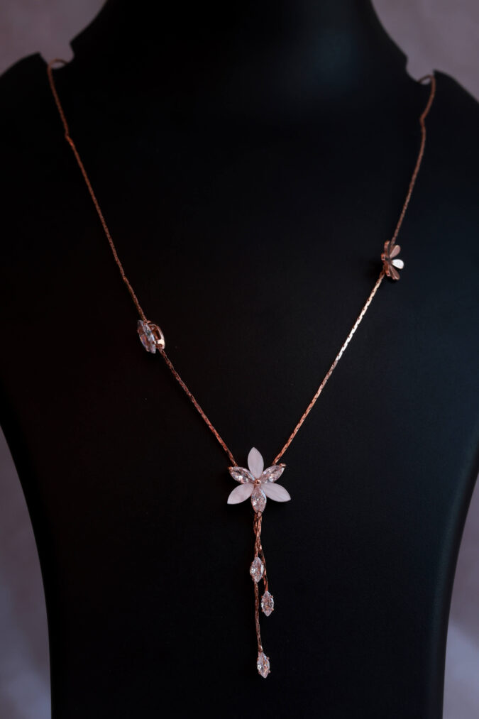 Rose Gold Tone Floral Y-Drop Necklace with White Petals and Crystal Dangles