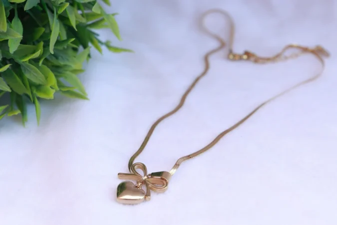 Gold Tone Snake Chain Necklace with Bow and Heart Pendant