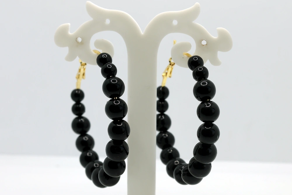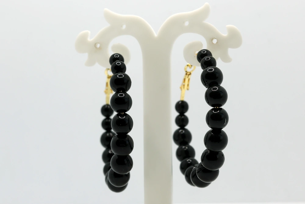The beads vary slightly in size, generally increasing in diameter towards the bottom of the hoop, creating a subtle tapering effect. The earrings are fastened with small, golden-toned hoop clasps at the top.