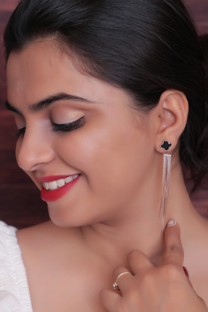 A pair of stylish dangle earrings, each featuring a black four-leaf clover or quatrefoil-shaped stud. From the bottom of the clover, numerous delicate, fine-link chains cascade downwards, creating a flowing tassel effect.