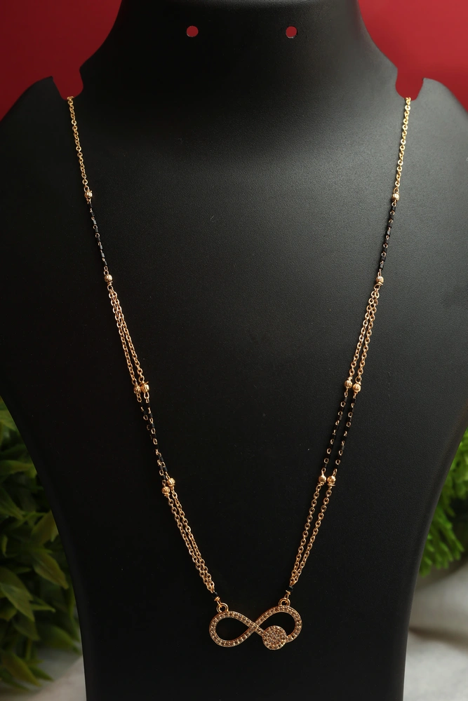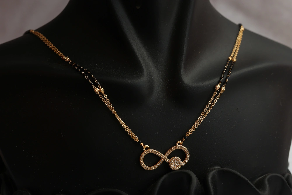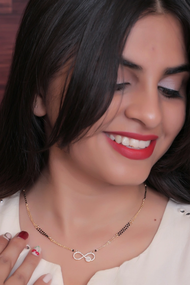 The infinity pendant is suspended from a double-strand chain, with one strand being a traditional black beaded mangalsutra chain and the other a delicate gold-plated chain with small, textured beads.