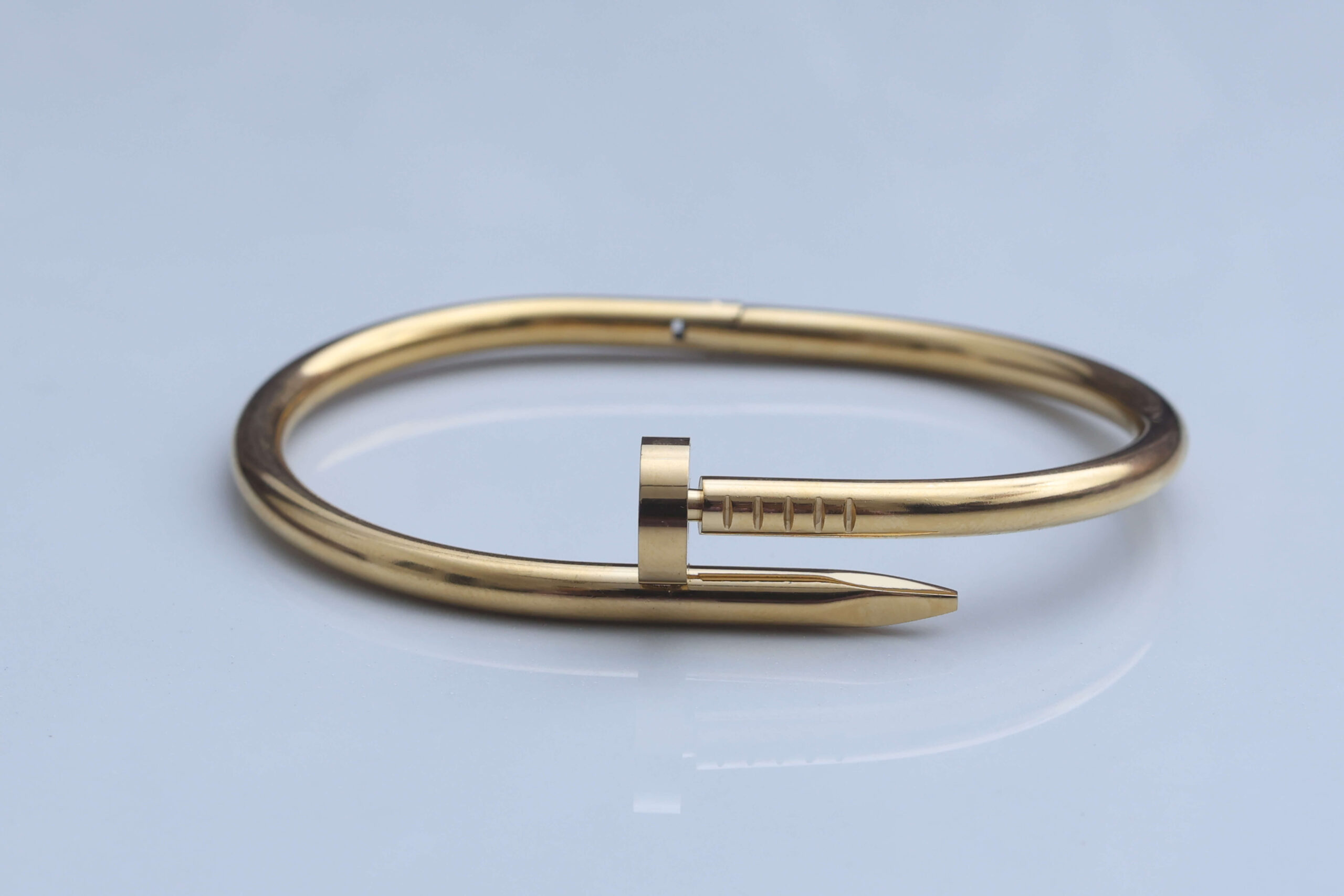 The head of the “nail” is prominently featured, with subtle etched lines mimicking a real nail. The pointed end of the “nail” extends around to complete the bangle. It appears to have a discreet clasp mechanism, possibly integrated into the design for a seamless look, allowing the bracelet to open and close