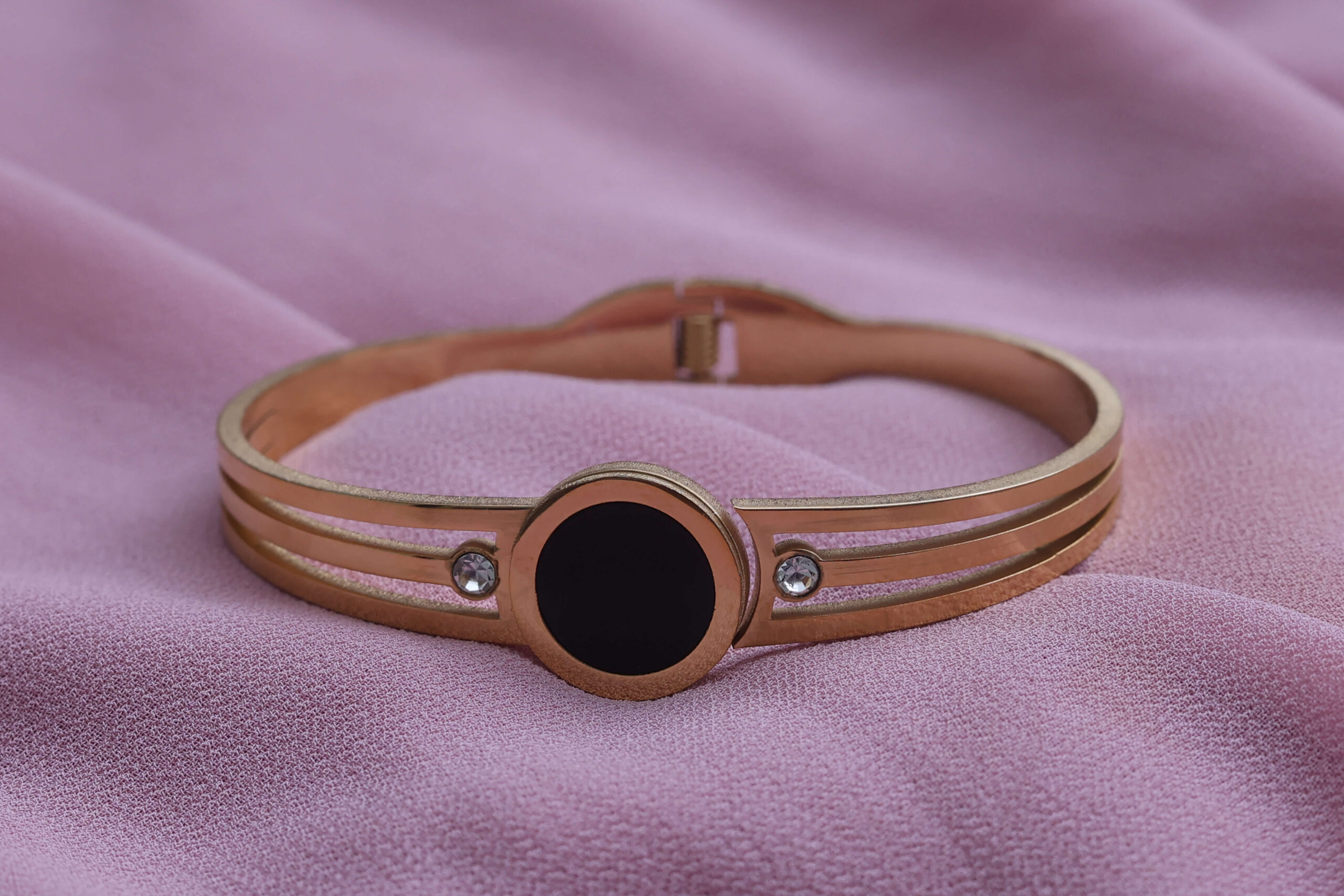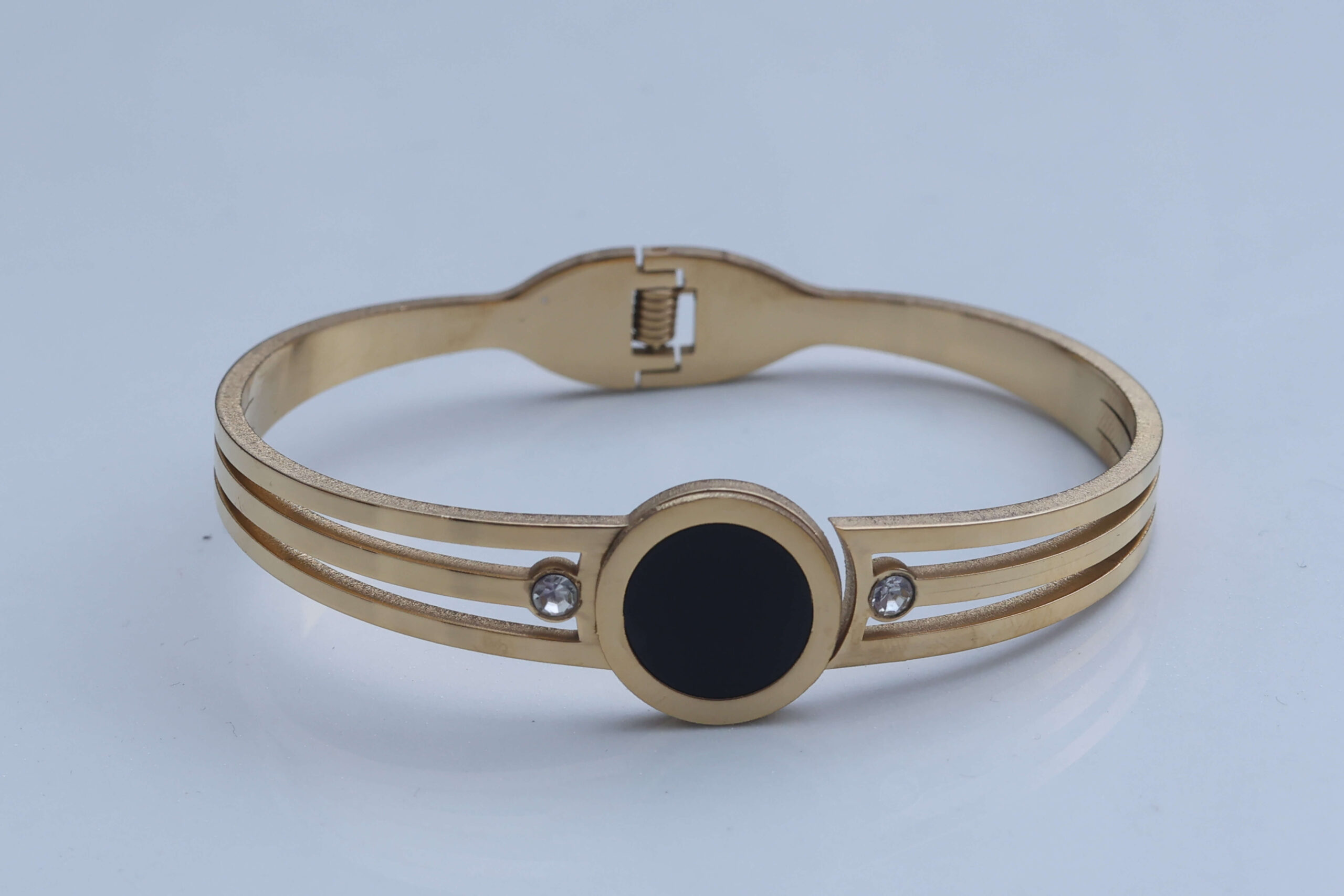 At the center of these bands is a prominent circular element with a polished black inlay, resembling onyx. Flanking this central disc on either side are small, sparkling clear crystals set within the bands