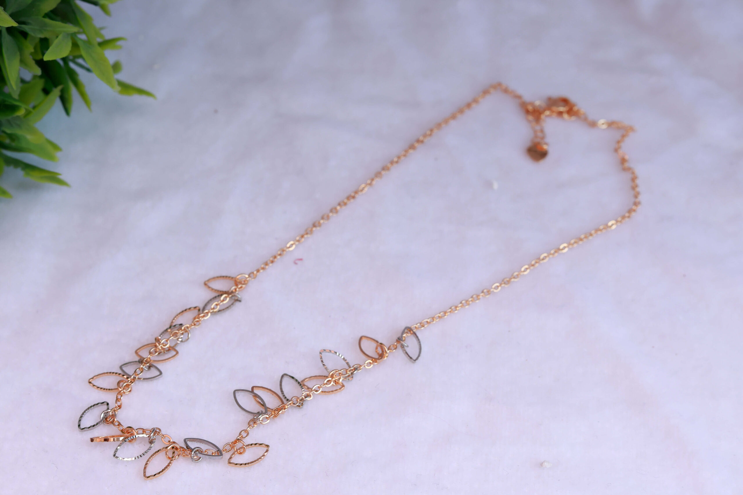 Rose Gold Tone Chain Necklace with Mixed-Finish Leaflet Dangles