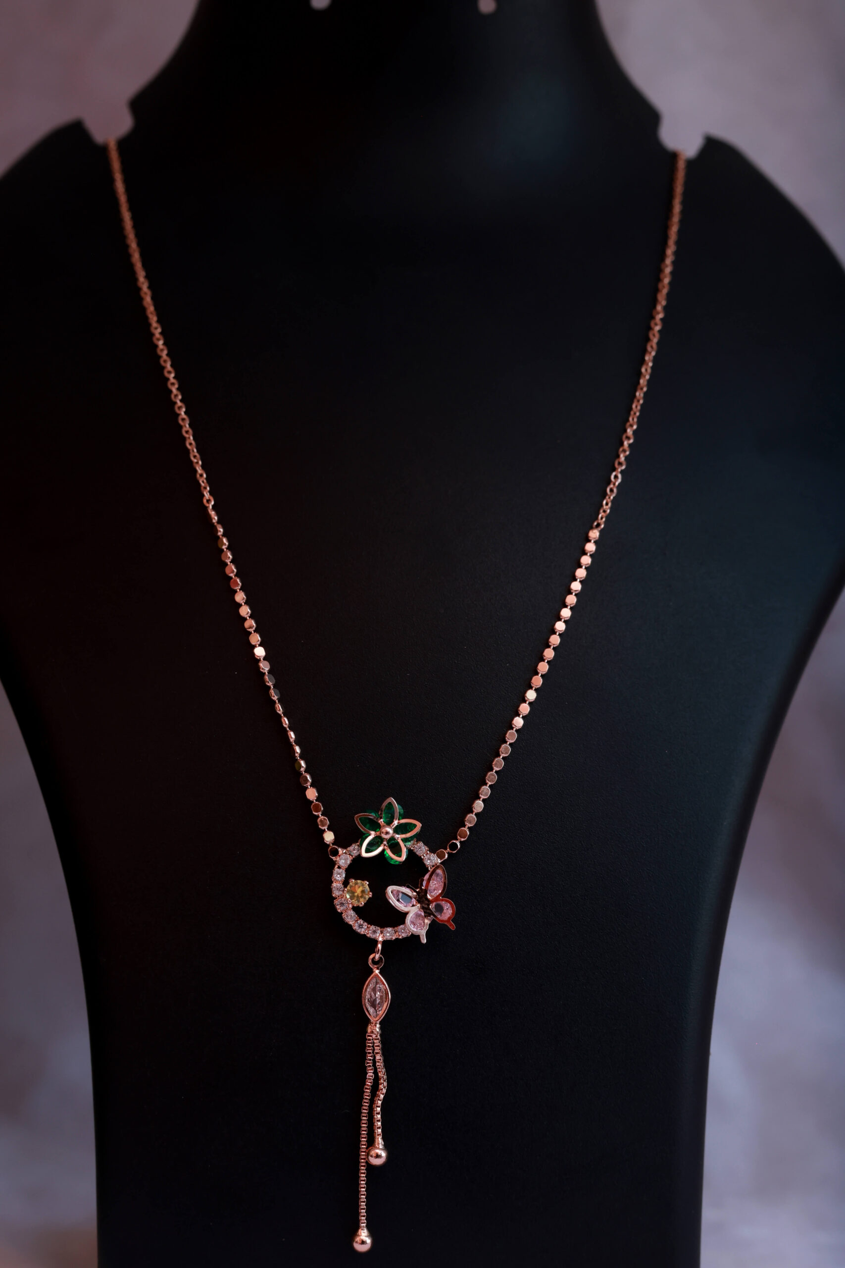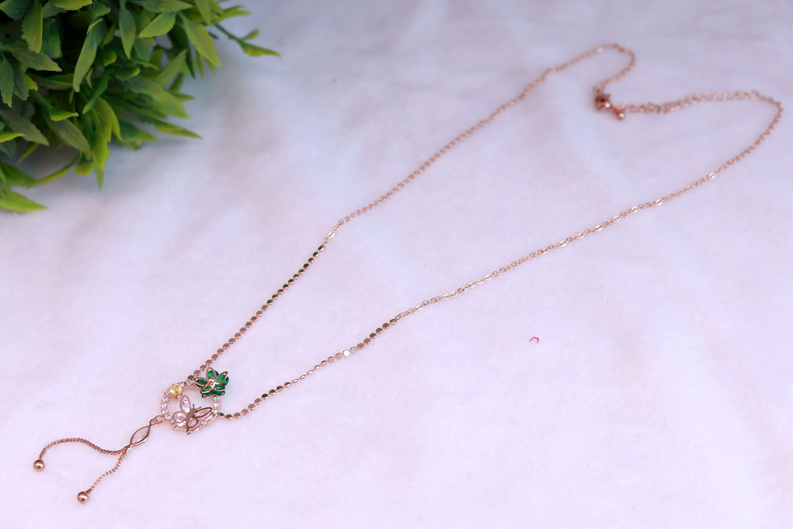 At the center of the necklace, a prominent circular pendant is adorned with intricate details. Within the circle, there are two distinct elements: a flower with green-hued petals and a vibrant butterfly with rose or pink-toned wings, both possibly embellished with small stones.