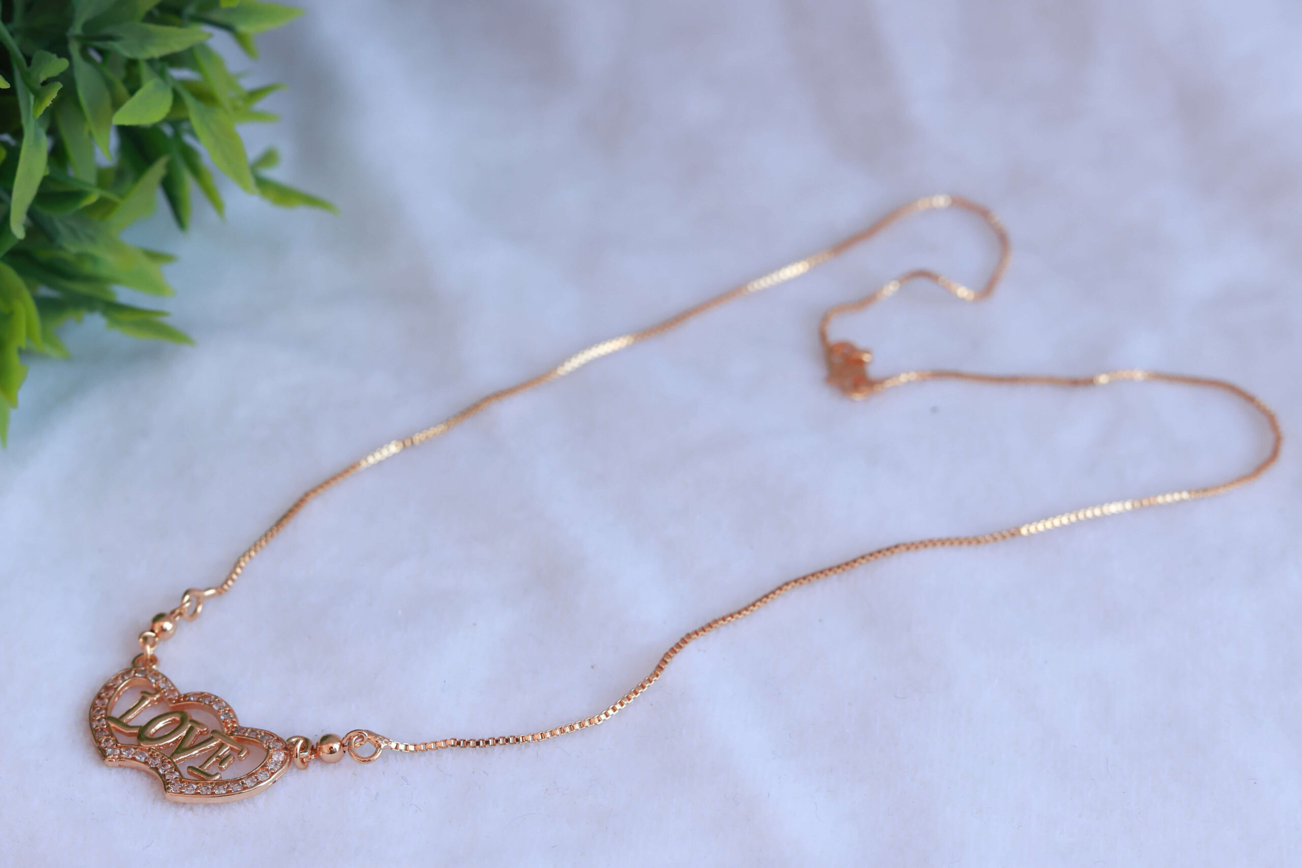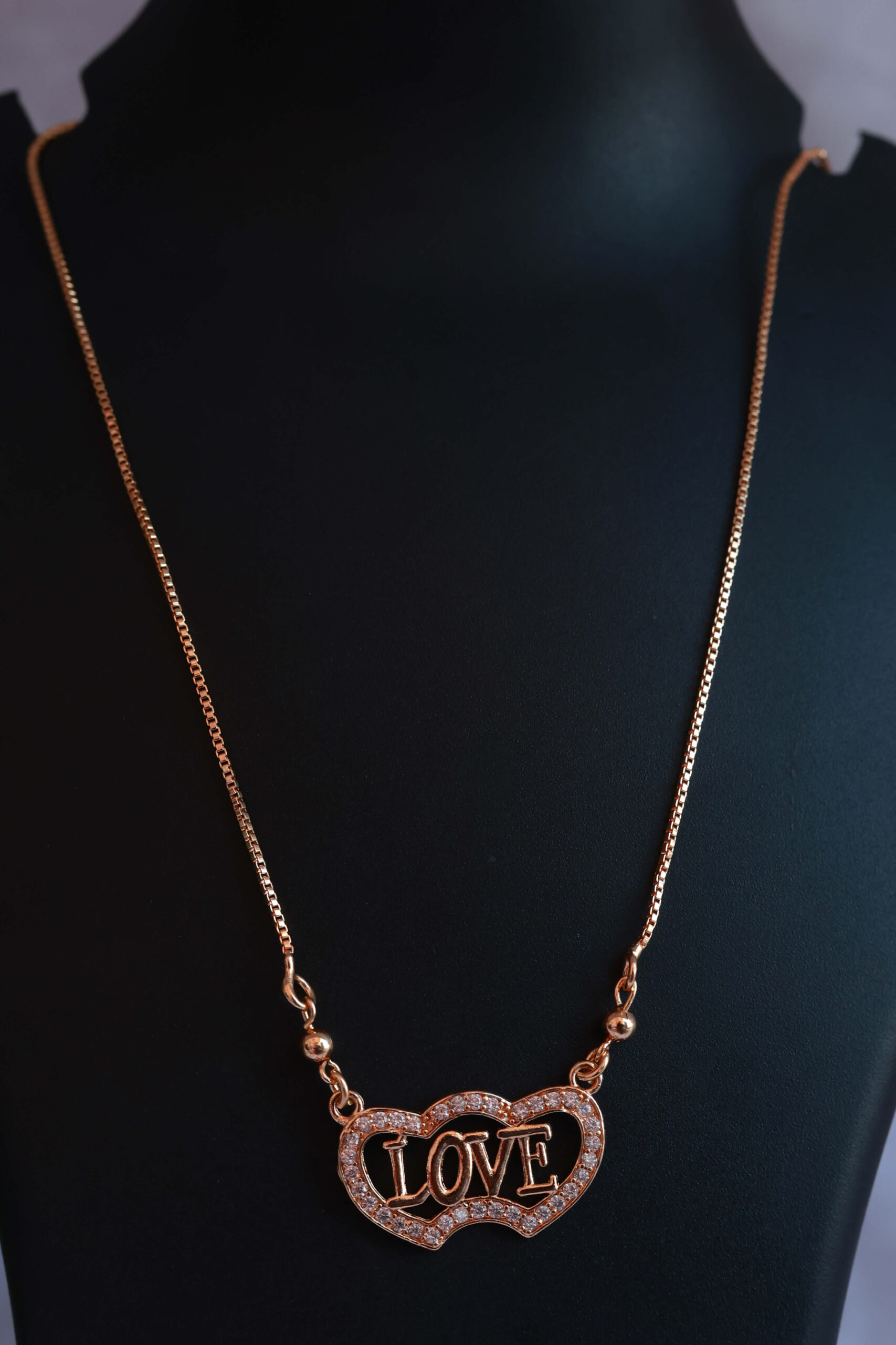 At the center, an intricately designed pendant spells out the word “LOVE” in a flowing, elegant script. The letters are adorned with small, sparkling clear stones, adding a touch of brilliance to the piece